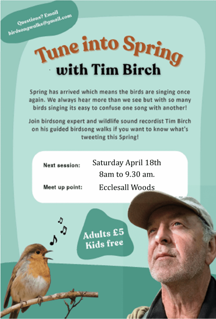 Just a quick message to share some information from Tim Birch about the bird‑song walks he’s now offering. Tim will be leading his first session in Ecclesall Woods on Saturday 18 April, running from8:00 to 9:30am. It’s a gentle, welcoming introduction to tuning in to the sounds of our local birdlife.
