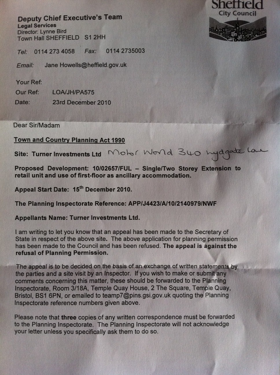 As expected, Turner Investments Ltd have submitted an appeal against the decision to refuse permission for planning application 10/02657/FUL, a convenience store in the current Motor World premises on Lydgate Lane.