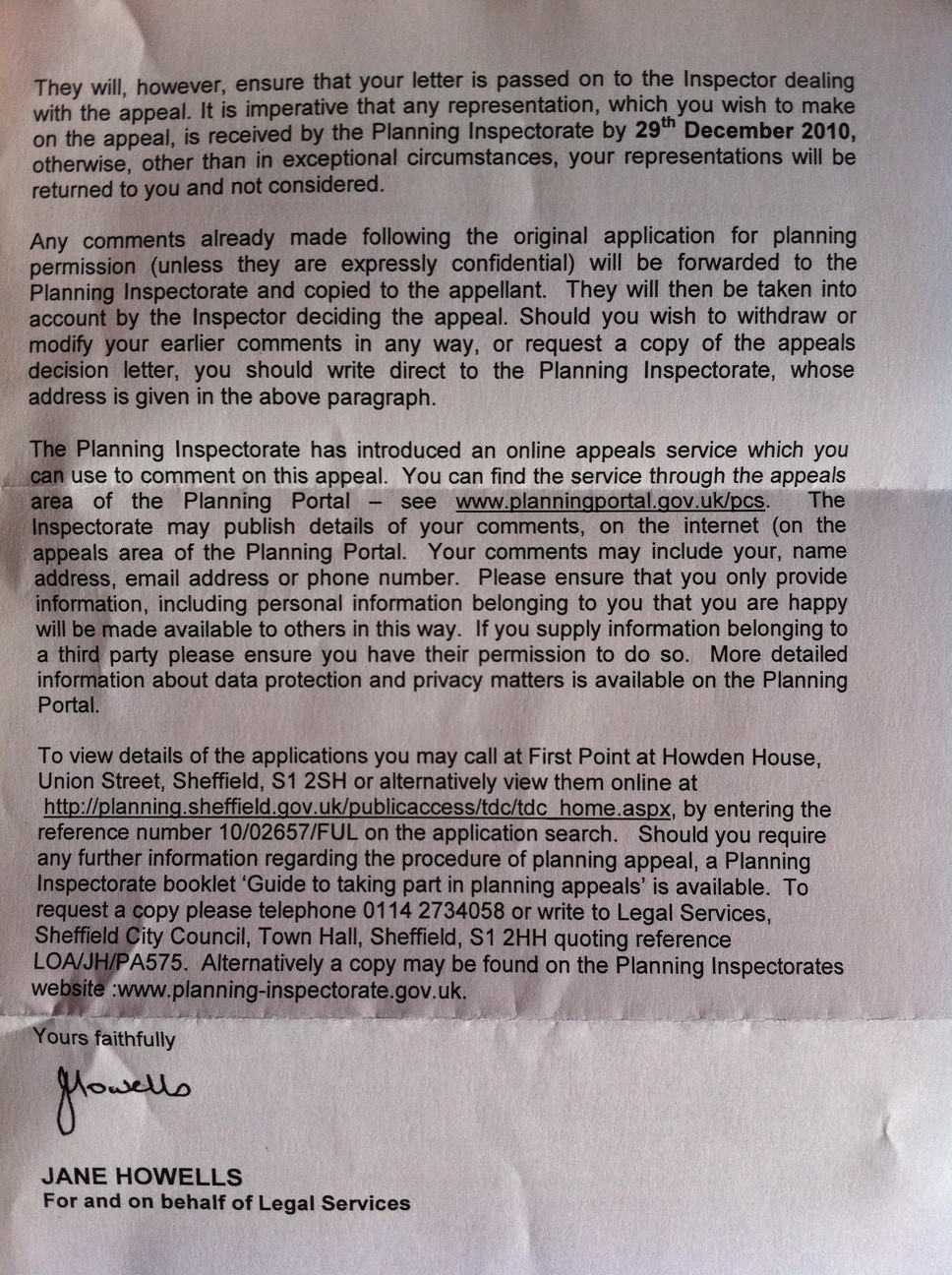 This morning, Crosspool residents who commented on the application received a letter stating that the appeal started on 15 December and it appears that the window for comments is due to close today, Wednesday 29 December. It turns out that this should have read Wednesday 26 January 2011. A revised letter expected shortly.
