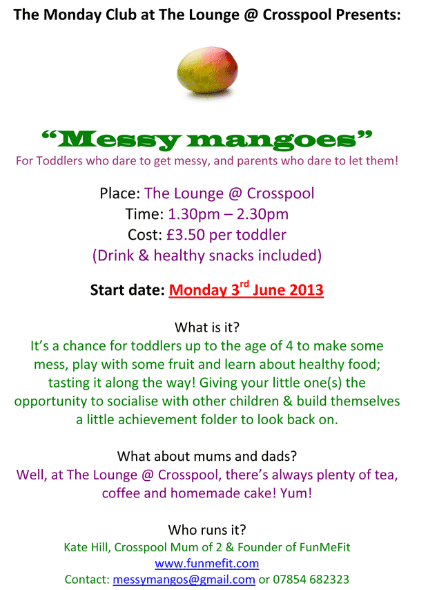 Messy Mangoes takes place at Lounge @ Crosspool on Mondays from 3 June between 1.30 and 2.30pm and lasts for six weeks.