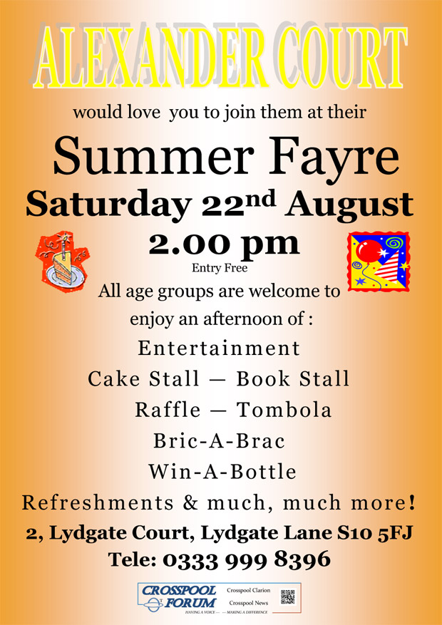 Posted on 18 Aug, 2015 by robinSummer Fayre at Alexander Court, Lydgate Lane on Saturday 22 August Summer Fayre at Alexander Court Share this: Click to share on Facebook (Opens in new window) Facebook Click to share on X (Opens in new window) X Click to email a link to a friend (Opens in new window) Email Click to print (Opens in new window) Print Like Loading... Related