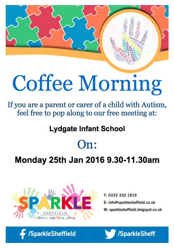 sparkle Coffee morning for parents or carers of children with autism Share this: Click to share on Facebook (Opens in new window) Facebook Click to share on X (Opens in new window) X Click to email a link to a friend (Opens in new window) Email Click to print (Opens in new window) Print Like Loading...