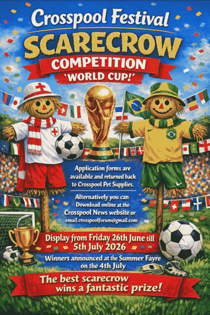 Make sure your scarecrow can be seen from the road. Judging runs until 3rd July, with winners revealed on Saturday 4th July. at the Crosspool Summer Fayre, CDYST Sports Venue, Coldwell Lane.