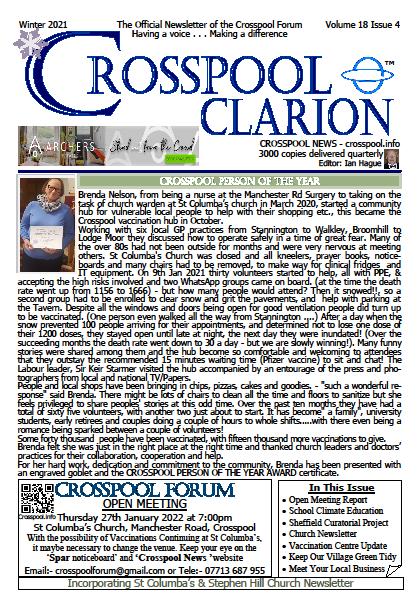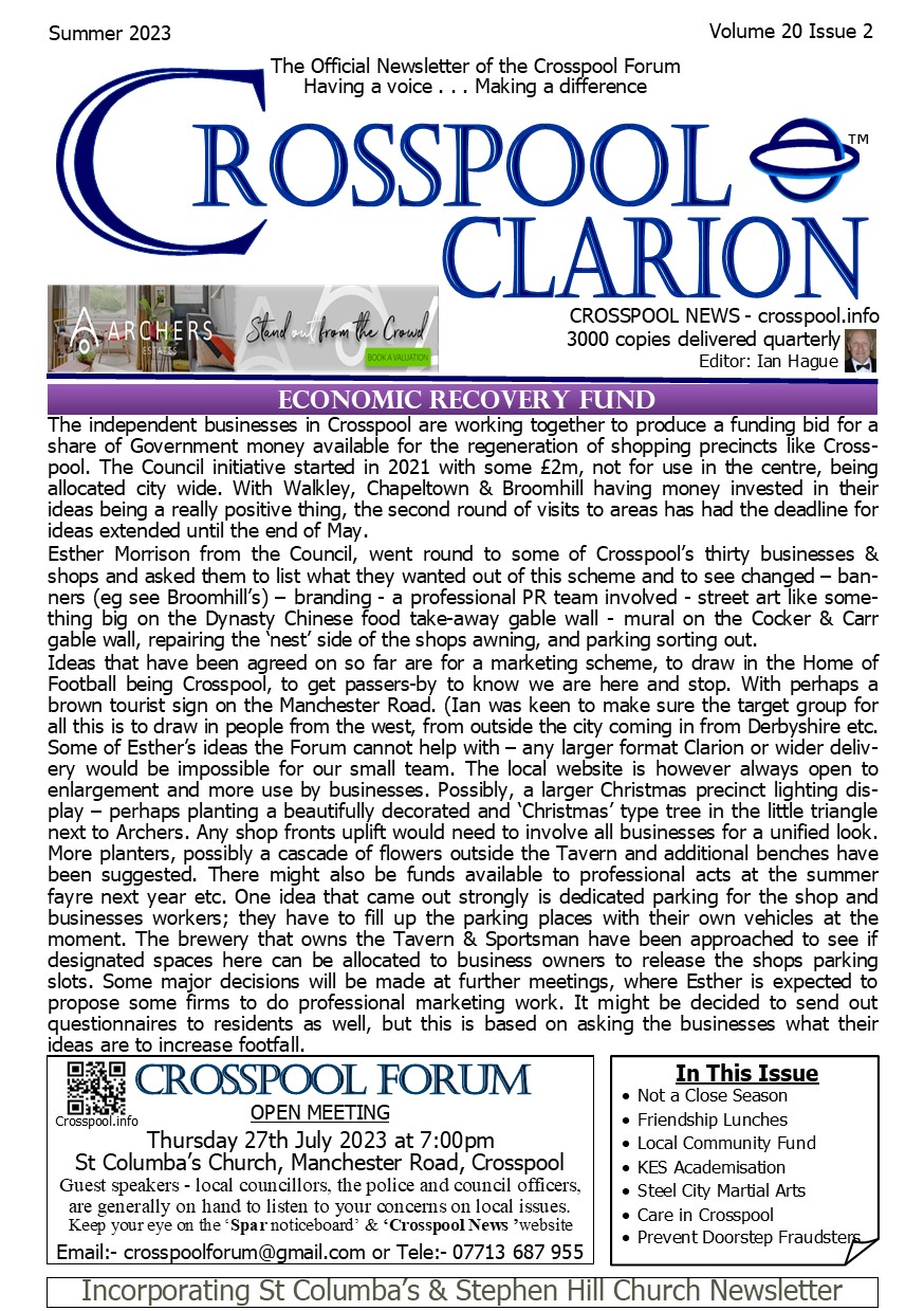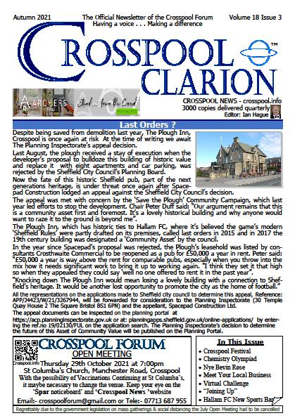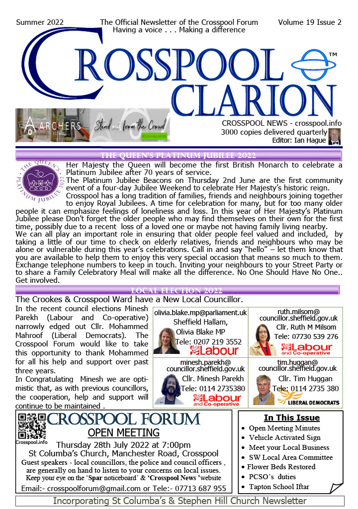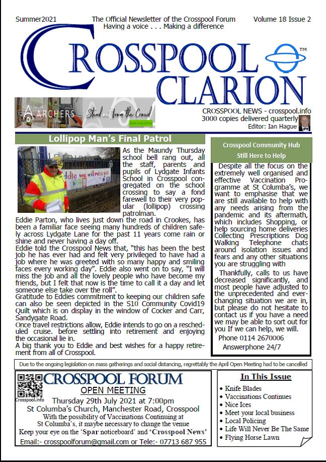 Distributed to over 3000 households in and around Crosspool, the Crosspool Clarion is a quarterly newsletter that covers news and events of the Crosspool area.