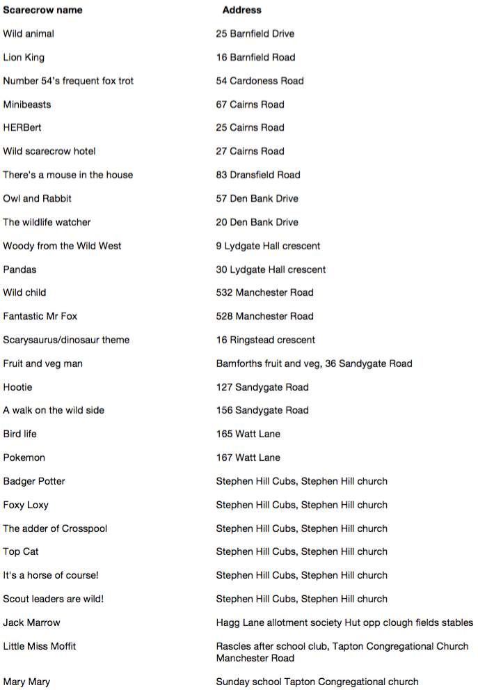 Here’s the list of scarecrows on view around Crosspool as part of the 2017 scarecrow competition.