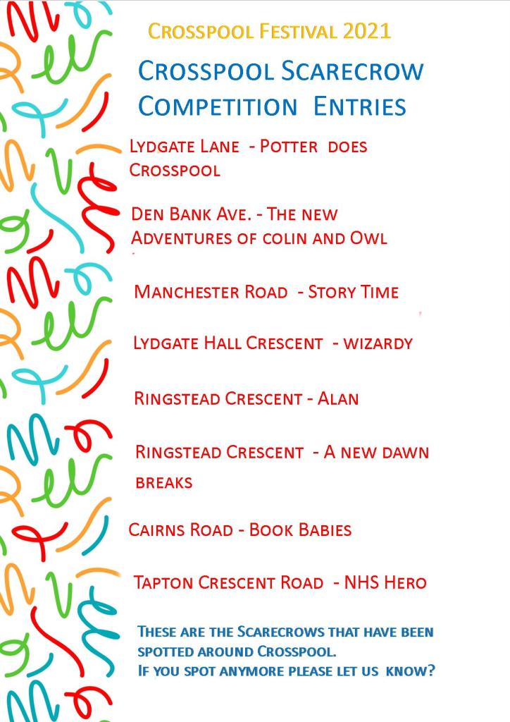 On behalf of the community of Crosspool, we would like to take this opportunity to give a ย big โThank Youโ to Michele Hatton forย organising this yearโs scarecrow competition, and also to express our gratitude to Glyn & Rob ย for making the time in their busy diaries to support the Crosspool community by selecting this yearโs winners.