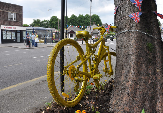 An official yellow tour flag is hanging above the chemist and a bike sprayed with yellow paint can now be found at the foot of the tree outside Spar.