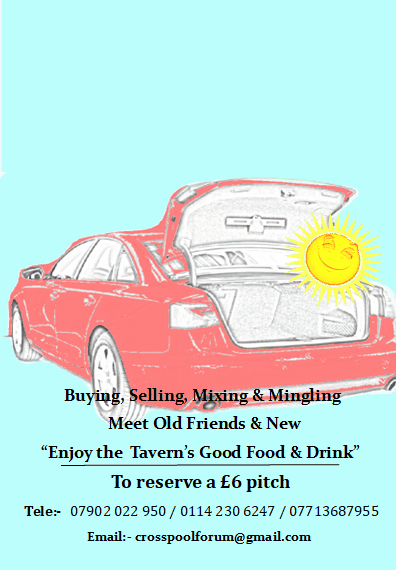 Crosspool Tavern Car Park To pre-book a £6 pitch Email: crosspoolforum@gmail.com Tele: – 07902 022 950/ 0114 230 6247/ 07713 687 955