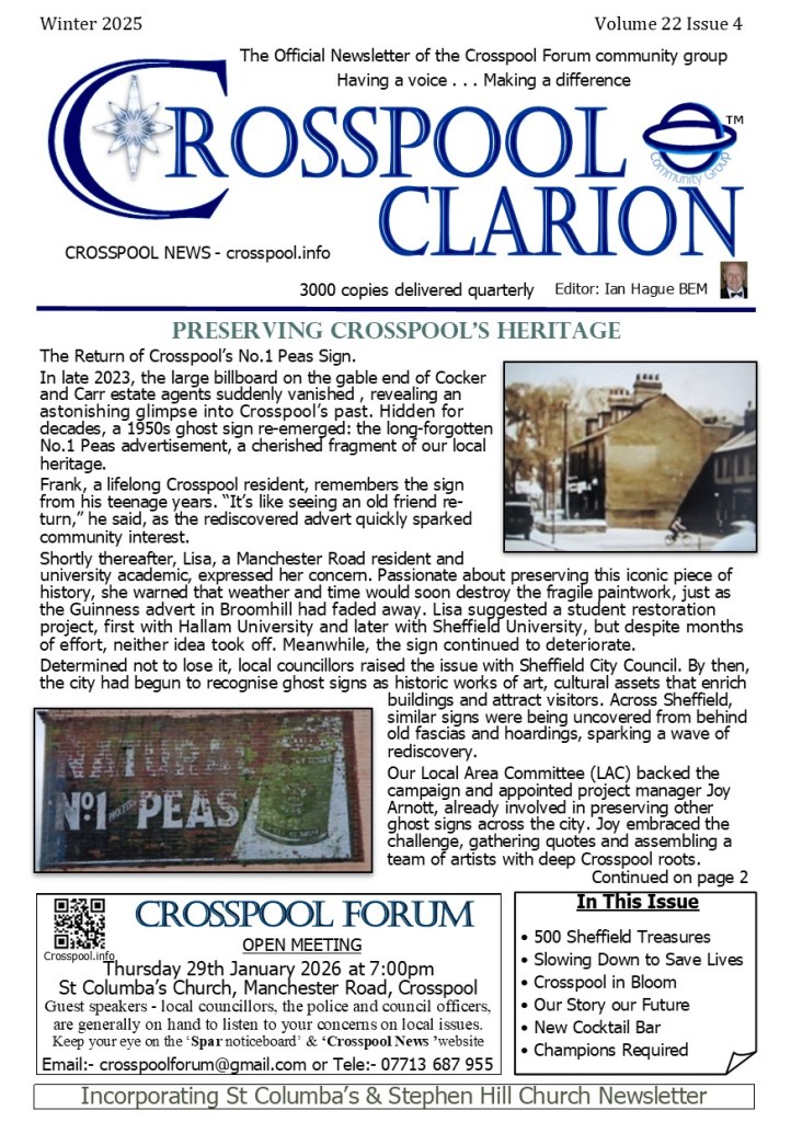 Crosspool Clarion is the official newsletter of the Crosspool Forum. It’s a free, quarterly publication, with over 3000 copies delivered to local households.