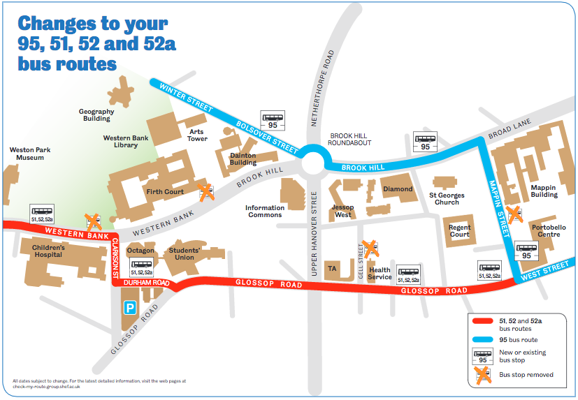 The 51 and 52 buses heading towards town will take a different route near the university and Weston Park from Monday 13 June.