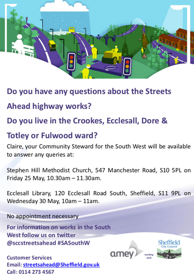 On Friday 23 February Amey and the Streets Ahead project will be at Stephen Hill Church on Manchester Road to take questions you may want to ask about their work in our area.