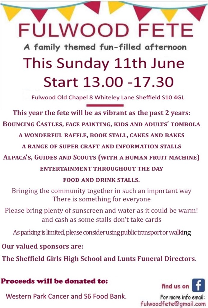 *****Fulwood Fete***** Tomorrow Sunday 11th June 13.00 – 17.30 Fulwood Old Chapel 8 Whiteley Lane Sheffield S10 4GL A family-friendly fun afternoon to raise money for local charities. Food, drinks, games, music and stalls. Something for everyone Proceeds will be donated to: Western Park Cancer Charity and S6 Food Bank. Please consider using public transport or walking as parking is limited.