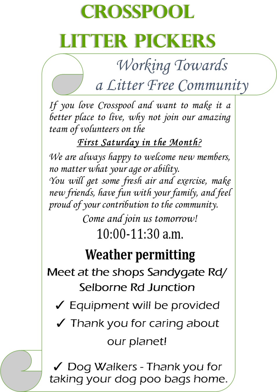 We are delighted to invite you to participate in our ongoing efforts to maintain a clean and pleasant neighbourhood. Building on the success of previous litter pickings, we aim to continue making a positive impact in the community.