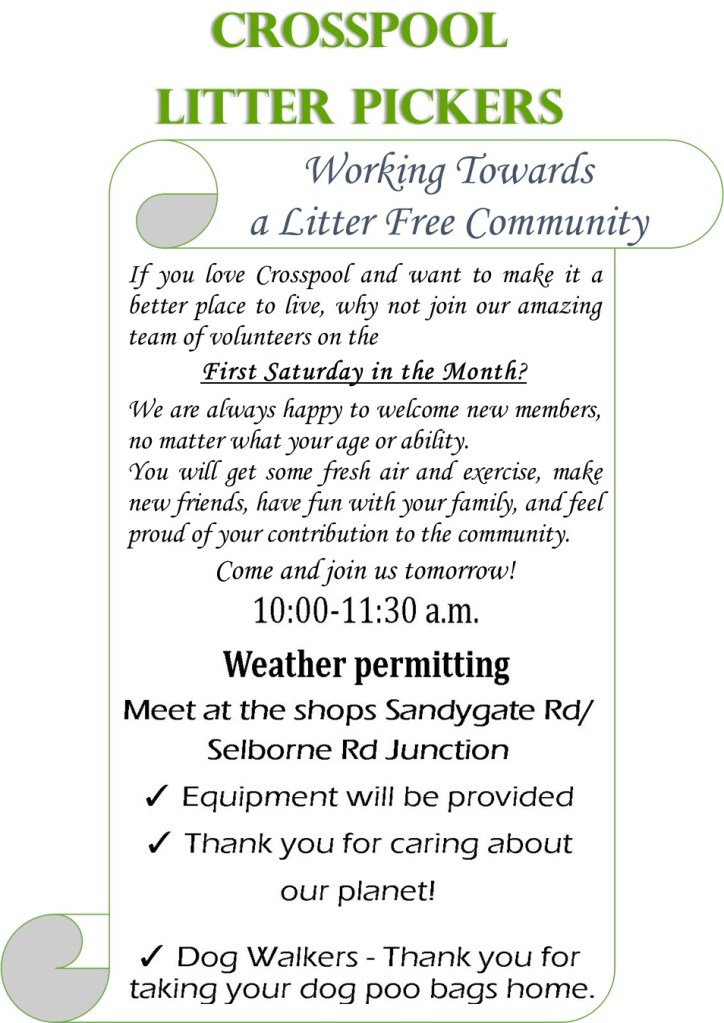 Meet outside the “Spar” in the Crosspool Shopping Precinct. This Saturday, 5th April 2025, Time: 10:00am to 11.15am.