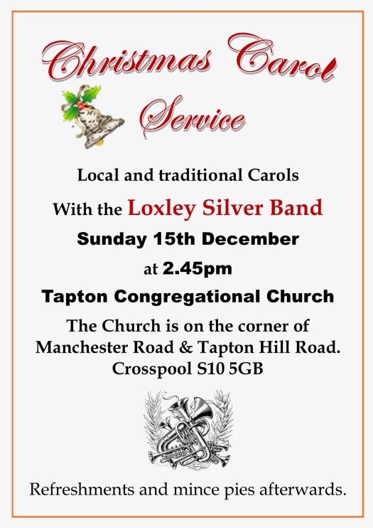 The Loxley Silver Band are delighted to be returning once again to Tapton Hill Congregational Church for the annual Christmas carol concert.